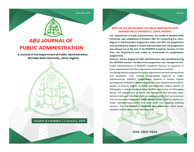 Vol. 8 No. 1 (2019)The ABU Journal of Public Administration (Vol. 8, No. 1, January 2019) presents a collection of insightful research articles and case studies focusing on contemporary issues in public administration, governance, and policy implementation. This edition features contributions from scholars and practitioners, offering diverse perspectives on administrative reforms, public sector management, and capacity development within Nigeria and beyond. The journal continues to serve as a platform for advancing knowledge and promoting best practices in public administration, contributing to the development of effective and transparent governance systems.